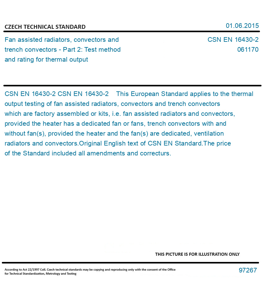 CSN EN 16430-2 This European Standard applies to the thermal output testing of fan assisted radiators, convectors and trench convectors which are factory assembled or kits, i.e. fan assisted radiators and convectors, provided the heater has a dedicated fan or fans, trench convectors with and without fan(s), provided the heater and the fan(s) are dedicated, ventilation radiators and convectors. Original English text of CSN EN Standard. The price of the Standard included all amendments and correcturs.