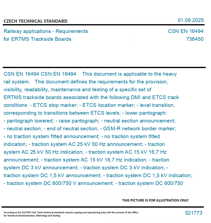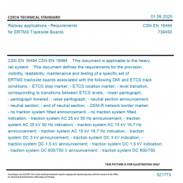 CSN EN 16494 This document is applicable to the heavy rail system. This document defines the requirements for the provision, visibility, readability, maintenance and testing of a specific set of ERTMS trackside boards associated with the following DMI and ETCS track conditions: - ETCS stop marker; - ETCS location marker; - level transition, corresponding to transitions between ETCS levels; - lower pantograph; - pantograph lowered; - raise pantograph; - neutral section announcement; - neutral section; - end of neutral section; - GSM-R network border marker; - no traction system fitted announcement; - no traction system fitted indication; - traction system AC 25 kV 50 Hz announcement; - traction system AC 25 kV 50 Hz indication; - traction system AC 15 kV 16,7 Hz announcement; - traction system AC 15 kV 16,7 Hz indication; - traction system DC 3 kV announcement; - traction system DC 3 kV indication; - traction system DC 1,5 kV announcement; - traction system DC 1,5 kV indication; - traction system DC 600/750 V announcement; - traction system DC 600/750 V indication; - activate the audible warning device (horn) indication; - safe stopping area announcement; - safe stopping area indication for start; - safe stopping area indication for end; - inhibition of brake announcement/indication for start/indication for revocation; - level crossing marker. NOTE The brake MBs apply for any of the three brake types (eddy current, magnetic shoe, regenerative), whereas the exact type concerned would be known by the driver via existing Route knowledge. The following ETCS track conditions are outside the scope of this document: - safe stopping area semi-continuous indication for in-between; - non-stopping area announcement; - non-stopping area indication for start; - non-stopping area indication for end; - non-stopping area semi-continuous indication for in-between; - close air conditioning intake announcement; - close air conditioning intake indication; - open air conditioning intake announcement; - open air conditioning intake indication. This document includes the arrangement of the boards and their interface with existing systems (track, cab design including cab sight lines, visibility by the driver and train head lamps). Mobile, backlit and temporary signs are not within the scope of this document. The application of ERTMS trackside boards is not within the scope of this document. Sighting requirements are not within the scope of this document. The sighting process needs to be implemented in accordance with national rules. Original English text of CSN EN Standard. The price of the Standard included all amendments and correcturs.