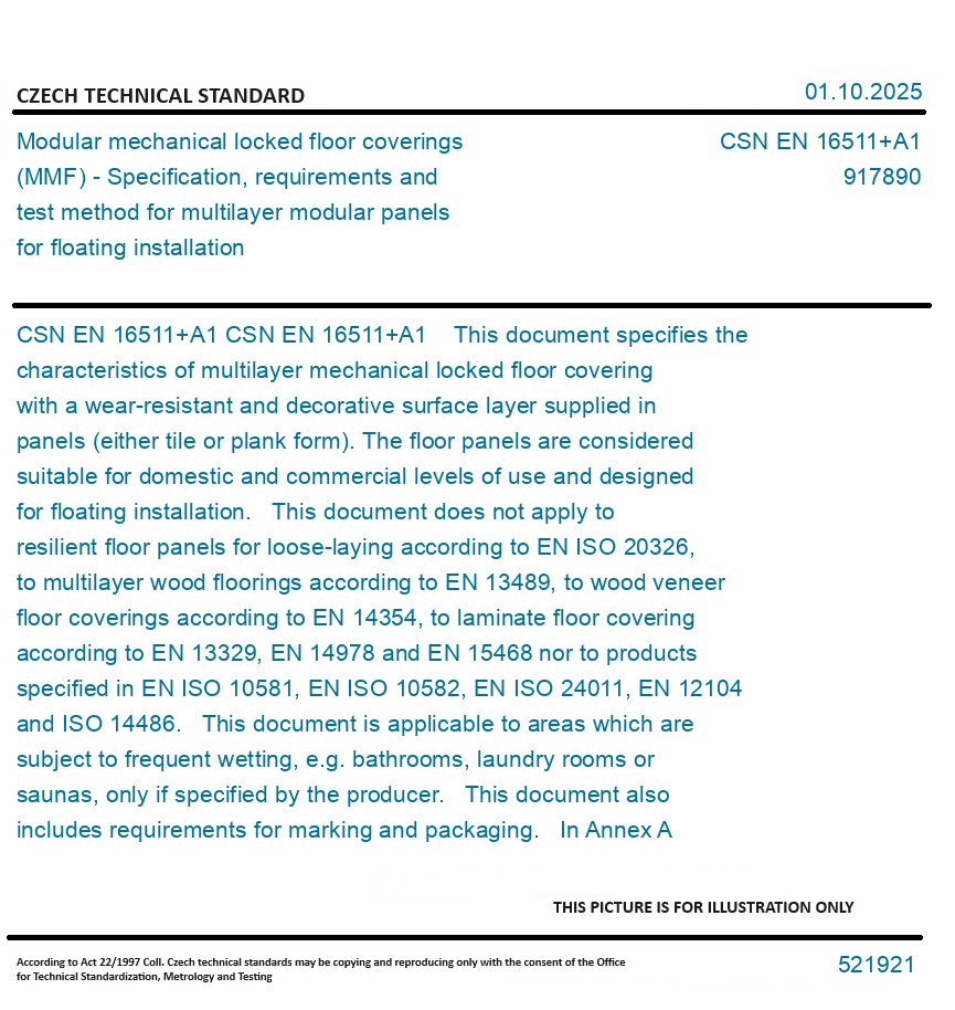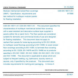 >CSN Standards>91 INTERIOR FURNISHING>9178 Floor coverings>CSN EN 16511+A1 - Modular mechanical locked floor coverings (MMF) - Specification, requirements and test method for multilayer modular panels for floating installation