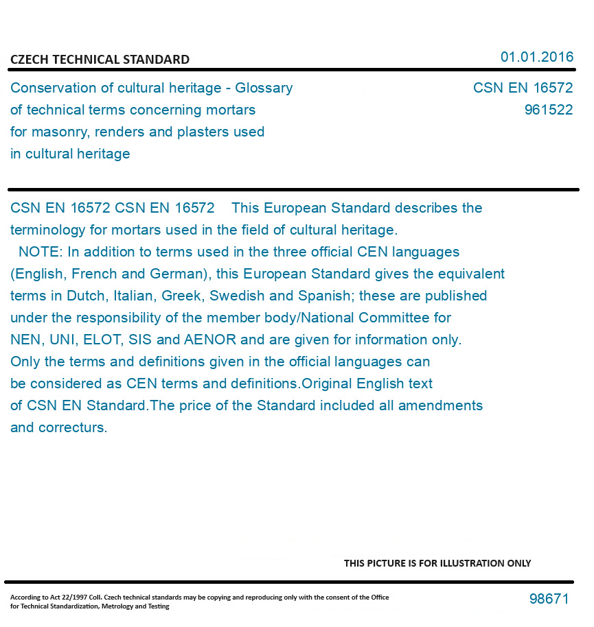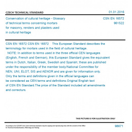 CSN EN 16572 This European Standard describes the terminology for mortars used in the field of cultural heritage. NOTE: In addition to terms used in the three official CEN languages (English, French and German), this European Standard gives the equivalent terms in Dutch, Italian, Greek, Swedish and Spanish; these are published under the responsibility of the member body/National Committee for NEN, UNI, ELOT, SIS and AENOR and are given for information only. Only the terms and definitions given in the official languages can be considered as CEN terms and definitions. Original English text of CSN EN Standard. The price of the Standard included all amendments and correcturs.