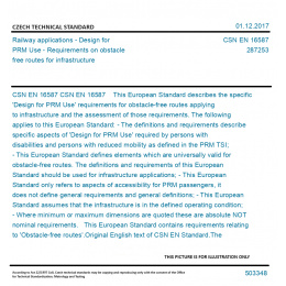 CSN EN 16587 This European Standard describes the specific 'Design for PRM Use' requirements for obstacle-free routes applying to infrastructure and the assessment of those requirements. The following applies to this European Standard: - The definitions and requirements describe specific aspects of 'Design for PRM Use' required by persons with disabilities and persons with reduced mobility as defined in the PRM TSI; - This European Standard defines elements which are universally valid for obstacle-free routes. The definitions and requirements of this European Standard should be used for infrastructure applications; - This European Standard only refers to aspects of accessibility for PRM passengers, it does not define general requirements and general definitions; - This European Standard assumes that the infrastructure is in the defined operating condition; - Where minimum or maximum dimensions are quoted these are absolute NOT nominal requirements. This European Standard contains requirements relating to 'Obstacle-free routes'. Original English text of CSN EN Standard. The price of the Standard included all amendments and correcturs.