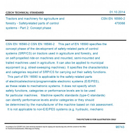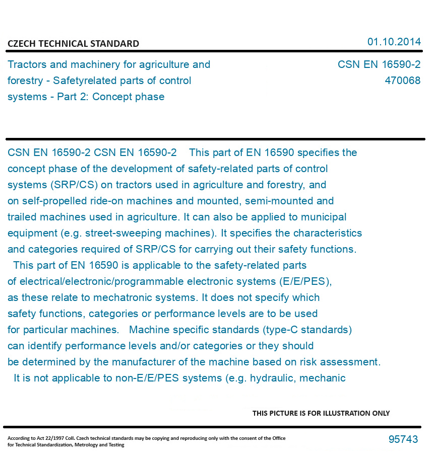 CSN EN 16590-2 This part of EN 16590 specifies the concept phase of the development of safety-related parts of control systems (SRP/CS) on tractors used in agriculture and forestry, and on self-propelled ride-on machines and mounted, semi-mounted and trailed machines used in agriculture. It can also be applied to municipal equipment (e.g. street-sweeping machines). It specifies the characteristics and categories required of SRP/CS for carrying out their safety functions. This part of EN 16590 is applicable to the safety-related parts of electrical/electronic/programmable electronic systems (E/E/PES), as these relate to mechatronic systems. It does not specify which safety functions, categories or performance levels are to be used for particular machines. Machine specific standards (type-C standards) can identify performance levels and/or categories or they should be determined by the manufacturer of the machine based on risk assessment. It is not applicable to non-E/E/PES systems (e.g. hydraulic, mechanic or pneumatic). Original English text of CSN EN Standard. The price of the Standard included all amendments and correcturs.