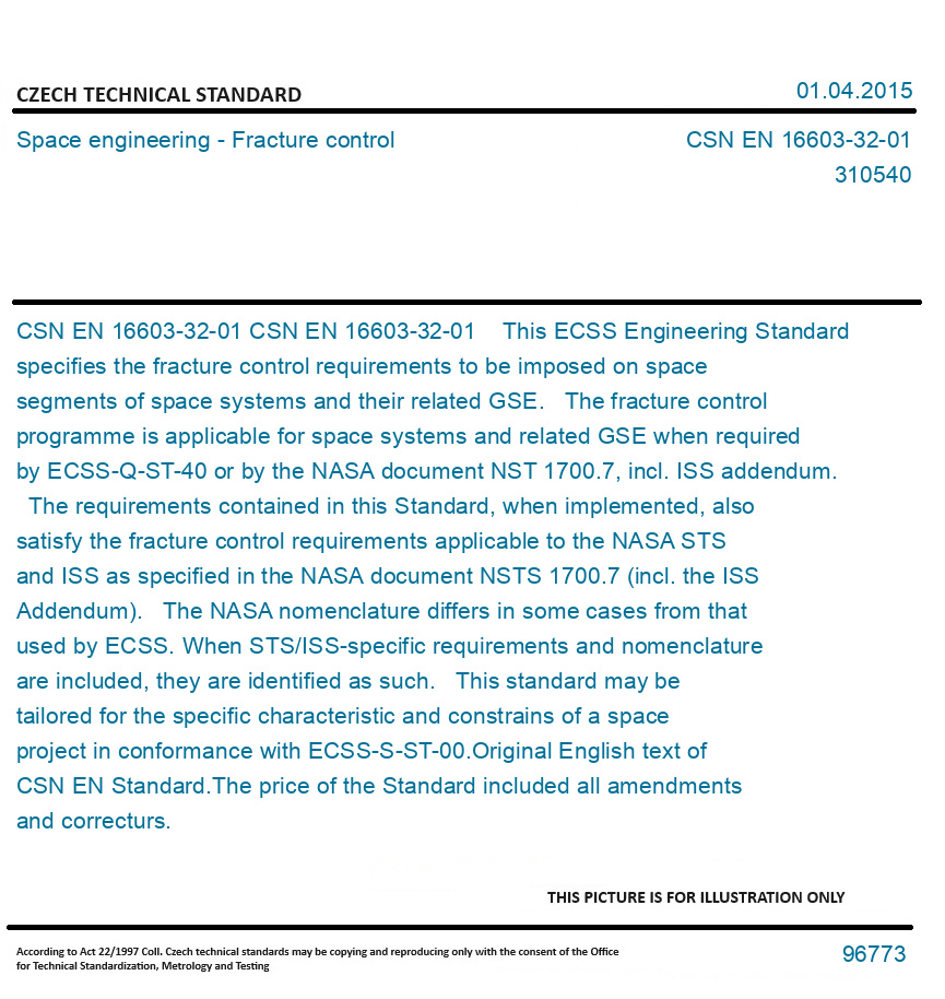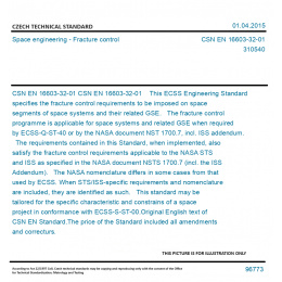 CSN EN 16603-32-01 This ECSS Engineering Standard specifies the fracture control requirements to be imposed on space segments of space systems and their related GSE. The fracture control programme is applicable for space systems and related GSE when required by ECSS-Q-ST-40 or by the NASA document NST 1700.7, incl. ISS addendum. The requirements contained in this Standard, when implemented, also satisfy the fracture control requirements applicable to the NASA STS and ISS as specified in the NASA document NSTS 1700.7 (incl. the ISS Addendum). The NASA nomenclature differs in some cases from that used by ECSS. When STS/ISS-specific requirements and nomenclature are included, they are identified as such. This standard may be tailored for the specific characteristic and constrains of a space project in conformance with ECSS-S-ST-00. Original English text of CSN EN Standard. The price of the Standard included all amendments and correcturs.