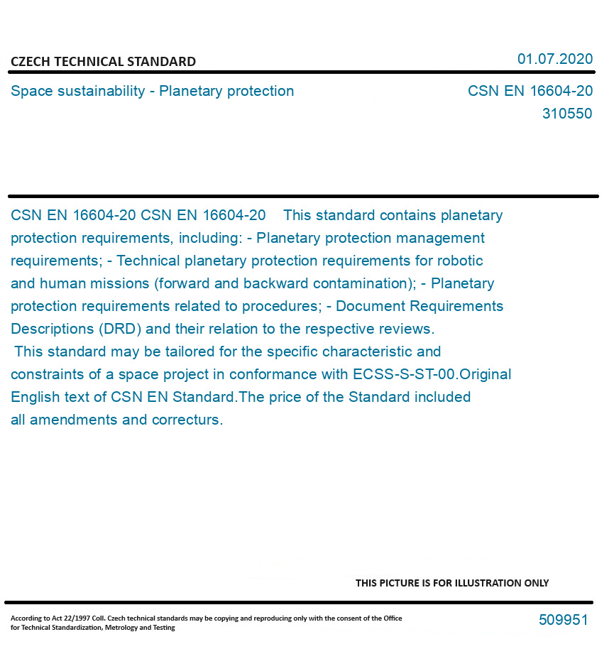 CSN EN 16604-20 This standard contains planetary protection requirements, including: - Planetary protection management requirements; - Technical planetary protection requirements for robotic and human missions (forward and backward contamination); - Planetary protection requirements related to procedures; - Document Requirements Descriptions (DRD) and their relation to the respective reviews. This standard may be tailored for the specific characteristic and constraints of a space project in conformance with ECSS-S-ST-00. Original English text of CSN EN Standard. The price of the Standard included all amendments and correcturs.