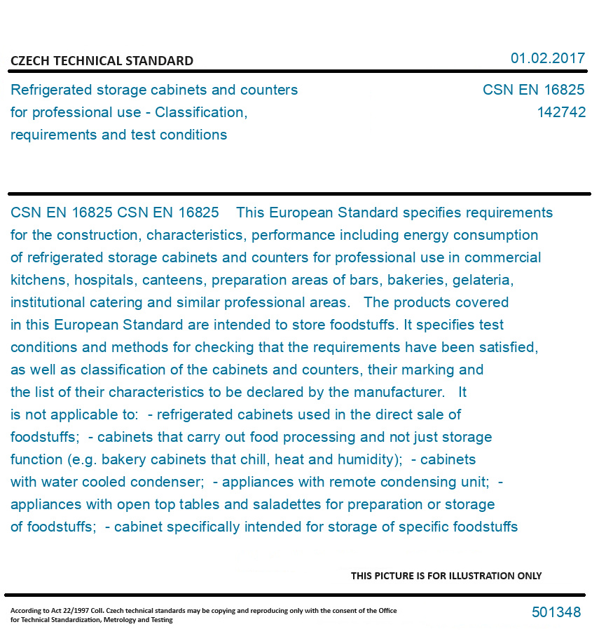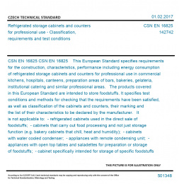 CSN EN 16825 This European Standard specifies requirements for the construction, characteristics, performance including energy consumption of refrigerated storage cabinets and counters for professional use in commercial kitchens, hospitals, canteens, preparation areas of bars, bakeries, gelateria, institutional catering and similar professional areas. The products covered in this European Standard are intended to store foodstuffs. It specifies test conditions and methods for checking that the requirements have been satisfied, as well as classification of the cabinets and counters, their marking and the list of their characteristics to be declared by the manufacturer. It is not applicable to: - refrigerated cabinets used in the direct sale of foodstuffs; - cabinets that carry out food processing and not just storage function (e.g. bakery cabinets that chill, heat and humidity); - cabinets with water cooled condenser; - appliances with remote condensing unit; - appliances with open top tables and saladettes for preparation or storage of foodstuffs; - cabinet specifically intended for storage of specific foodstuffs (i.e. fresh meat, fresh fish, etc.) operating at a temperature different from those specified in Table 1; - chest freezers; - appliances intended for short time /intermittent normal operation during the full day; - built-in cabinet; - roll-in cabinet; - pass-through cabinet. Original English text of CSN EN Standard. The price of the Standard included all amendments and correcturs.