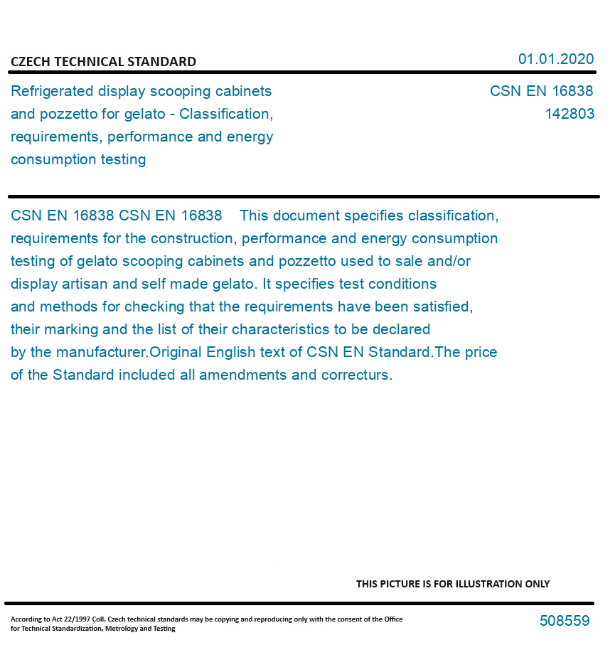 CSN EN 16838 This document specifies classification, requirements for the construction, performance and energy consumption testing of gelato scooping cabinets and pozzetto used to sale and/or display artisan and self made gelato. It specifies test conditions and methods for checking that the requirements have been satisfied, their marking and the list of their characteristics to be declared by the manufacturer. Original English text of CSN EN Standard. The price of the Standard included all amendments and correcturs.