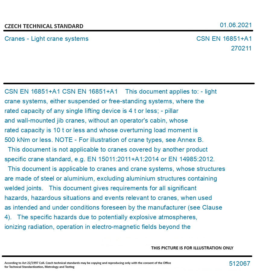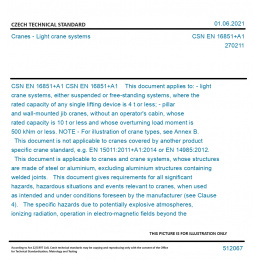 CSN EN 16851+A1 This document applies to: - light crane systems, either suspended or free-standing systems, where the rated capacity of any single lifting device is 4 t or less; - pillar and wall-mounted jib cranes, without an operator's cabin, whose rated capacity is 10 t or less and whose overturning load moment is 500 kNm or less. NOTE - For illustration of crane types, see Annex B. This document is not applicable to cranes covered by another product specific crane standard, e.g. EN 15011:2011+A1:2014 or EN 14985:2012. This document is applicable to cranes and crane systems, whose structures are made of steel or aluminium, excluding aluminium structures containing welded joints. This document gives requirements for all significant hazards, hazardous situations and events relevant to cranes, when used as intended and under conditions foreseen by the manufacturer (see Clause 4). The specific hazards due to potentially explosive atmospheres, ionizing radiation, operation in electro-magnetic fields beyond the range of EN 61000 6 2:2016 and operation in pharmacy or food industry are not covered by this document. This document does not cover hazards related to the lifting of persons. This document is applicable to cranes, which are manufactured after the date of its publication by CEN as a European Standard. This document is not applicable to cranes manufactured before the date of its publication Original English text of CSN EN Standard. The price of the Standard included all amendments and correcturs.