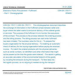 CSN EN 17017-1 This choreographies document describes the exchange of information in the Fulfilment phase between seller and buyer where the seller wants to announce delivery of the ordered goods or services. The purpose of the fulfilment it is to monitor the executions of the contract. This process is the process between the ordering process and the billing process. The billing process can start when fulfilment has been initiated. The business value for this is: - To prepare the buyers organization for the physical delivery; - To enabling an automatic check of delivery for the buying organization before paying the received invoice; - To match the ordered products with the physical deliveries, such as serial numbers, lot identifiers and other information that might not be present at the time the goods were ordered; - The assist in getting an accurate calculation of the environmental footprint of the goods by including the emission during the transport; - To feed data into the logistic process, so no retyping is needed during the transport of the goods. The identifier of this set of choreographies is EN 17017-1:2025 How to claim conformance to a choreography variant defined in this document is described in 4.2.3.