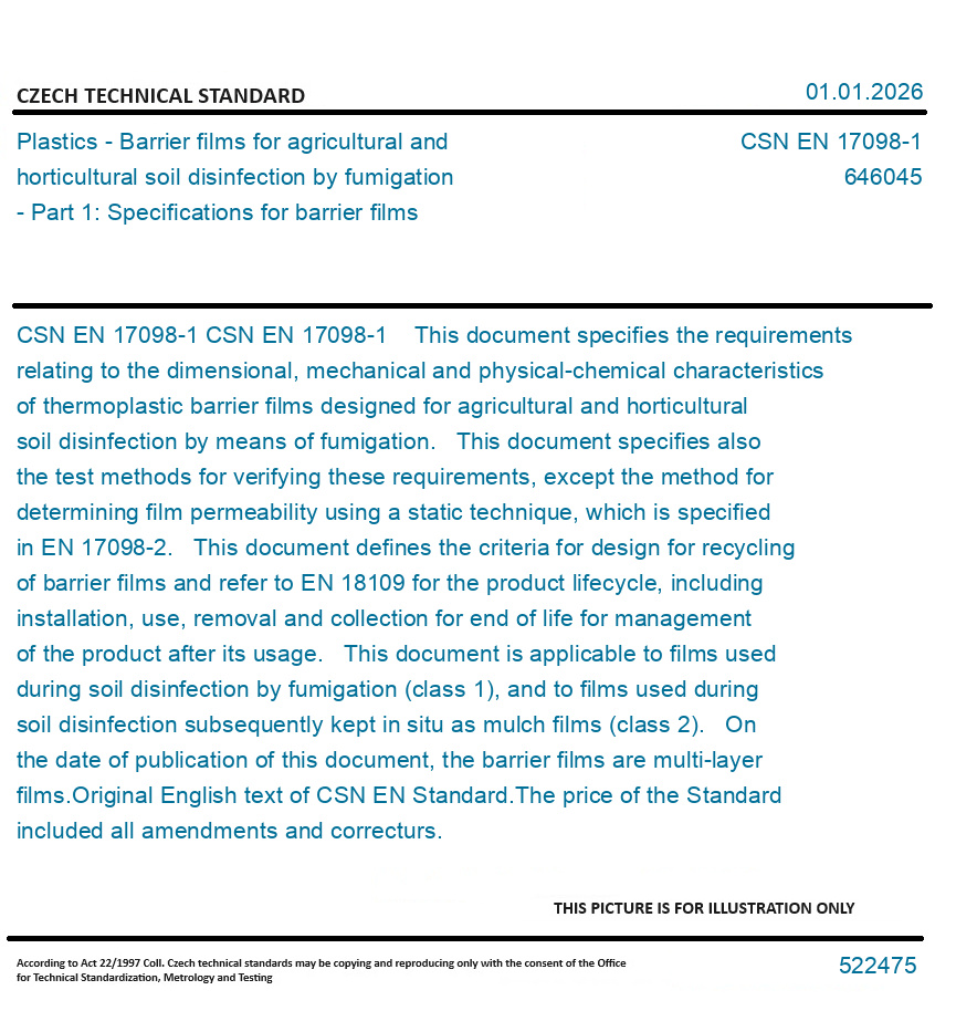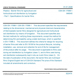 CSN EN 17098-1 This document specifies the requirements relating to the dimensional, mechanical and physical-chemical characteristics of thermoplastic barrier films designed for agricultural and horticultural soil disinfection by means of fumigation. This document specifies also the test methods for verifying these requirements, except the method for determining film permeability using a static technique, which is specified in EN 17098-2. This document defines the criteria for design for recycling of barrier films and refer to EN 18109 for the product lifecycle, including installation, use, removal and collection for end of life for management of the product after its usage. This document is applicable to films used during soil disinfection by fumigation (class 1), and to films used during soil disinfection subsequently kept in situ as mulch films (class 2). On the date of publication of this document, the barrier films are multi-layer films.