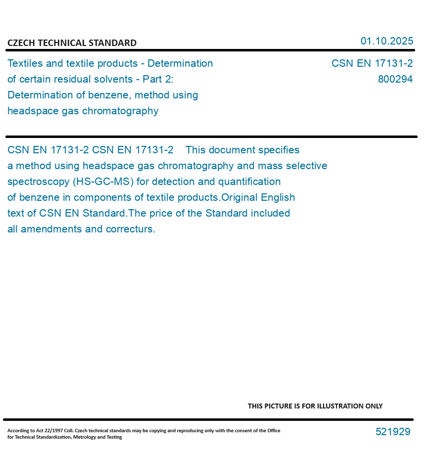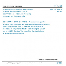 CSN EN 17131-2 This document specifies a method using headspace gas chromatography and mass selective spectroscopy (HS-GC-MS) for detection and quantification of benzene in components of textile products. Original English text of CSN EN Standard. The price of the Standard included all amendments and correcturs.