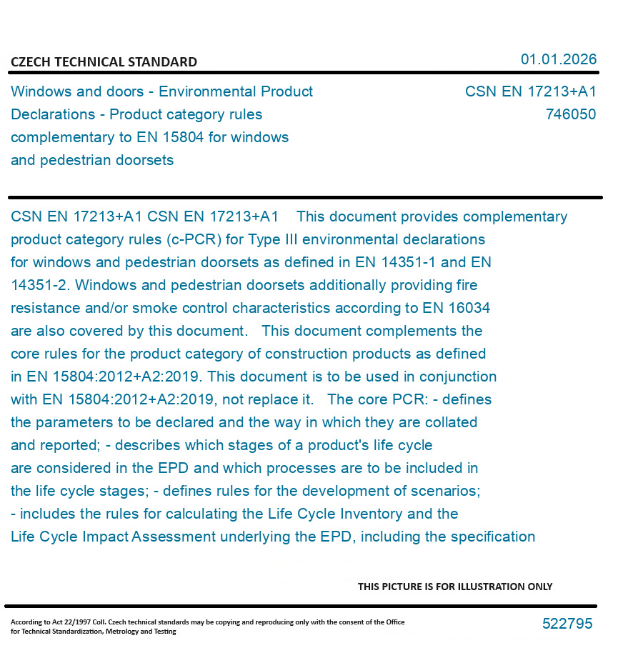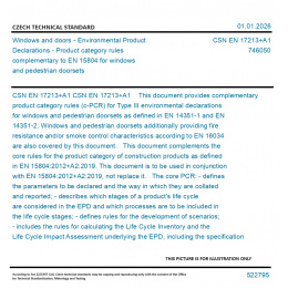 CSN EN 17213+A1 This document provides complementary product category rules (c-PCR) for Type III environmental declarations for windows and pedestrian doorsets as defined in EN 14351-1 and EN 14351-2. Windows and pedestrian doorsets additionally providing fire resistance and/or smoke control characteristics according to EN 16034 are also covered by this document. This document complements the core rules for the product category of construction products as defined in EN 15804:2012+A2:2019. This document is to be used in conjunction with EN 15804:2012+A2:2019, not replace it. The core PCR: - defines the parameters to be declared and the way in which they are collated and reported; - describes which stages of a product's life cycle are considered in the EPD and which processes are to be included in the life cycle stages; - defines rules for the development of scenarios; - includes the rules for calculating the Life Cycle Inventory and the Life Cycle Impact Assessment underlying the EPD, including the specification of the data quality to be applied; - includes the rules for reporting the predetermined, environmental and health information that is not covered by Life Cycle Assessment (LCA) for the product, construction process(es) and construction service(s), as relevant; - defines the conditions under which construction products can be compared based on the information provided by EPD. For the EPD of construction services the same rules and requirements apply as for the EPD of construction products.