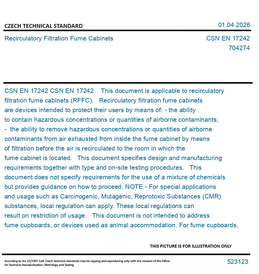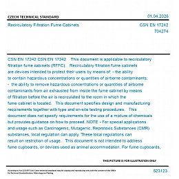 CSN EN 17242 This document is applicable to recirculatory filtration fume cabinets (RFFC). Recirculatory filtration fume cabinets are devices intended to protect their users by means of: - the ability to contain hazardous concentrations or quantities of airborne contaminants; - the ability to remove hazardous concentrations or quantities of airborne contaminants from air exhausted from inside the fume cabinet by means of filtration before the air is recirculated to the room in which the fume cabinet is located. This document specifies design and manufacturing requirements together with type and on-site testing procedures. This document does not specify requirements for the use of a mixture of chemicals but provides guidance on how to proceed. NOTE - For special applications and usage such as Carcinogenic, Mutagenic, Reprotoxic Substances (CMR) substances, local regulation can apply. These local regulations can result on restriction of usage. This document is not intended to address fume cupboards, or devices used as animal accommodation. For fume cupboards, the EN 14175 series applies. For microbiological safety cabinets, EN 12469 applies.