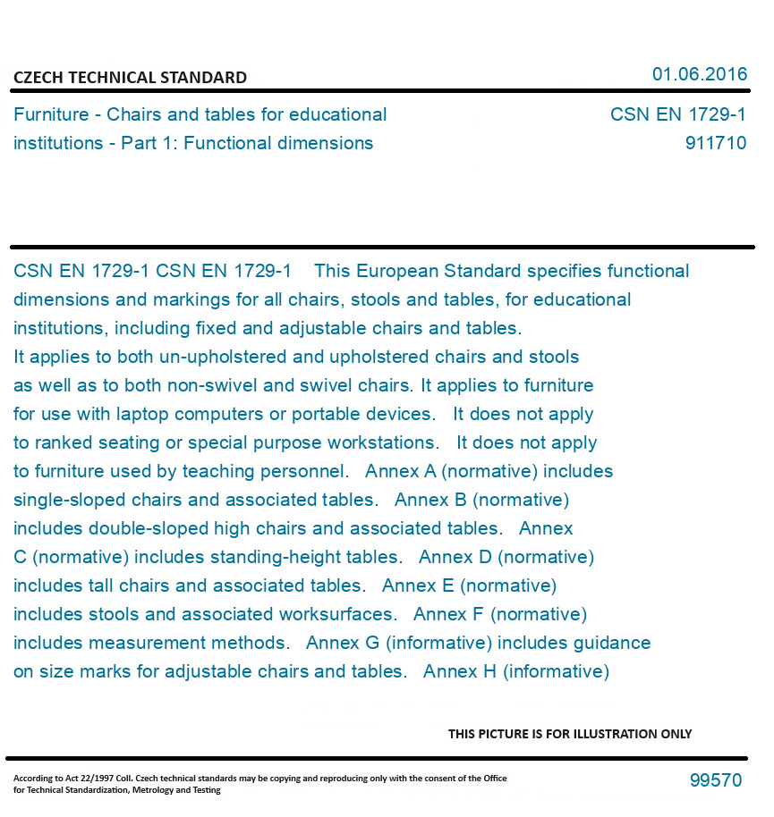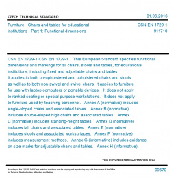 CSN EN 1729-1 This European Standard specifies functional dimensions and markings for all chairs, stools and tables, for educational institutions, including fixed and adjustable chairs and tables. It applies to both un-upholstered and upholstered chairs and stools as well as to both non-swivel and swivel chairs. It applies to furniture for use with laptop computers or portable devices. It does not apply to ranked seating or special purpose workstations. It does not apply to furniture used by teaching personnel. Annex A (normative) includes single-sloped chairs and associated tables. Annex B (normative) includes double-sloped high chairs and associated tables. Annex C (normative) includes standing-height tables. Annex D (normative) includes tall chairs and associated tables. Annex E (normative) includes stools and associated worksurfaces. Annex F (normative) includes measurement methods. Annex G (informative) includes guidance on size marks for adjustable chairs and tables. Annex H (informative) includes guidance on calculating heights of double-sloped chairs and associated tables. Annex I (informative) includes a rationale for functional dimensions. Original English text of CSN EN Standard. The price of the Standard included all amendments and correcturs.
