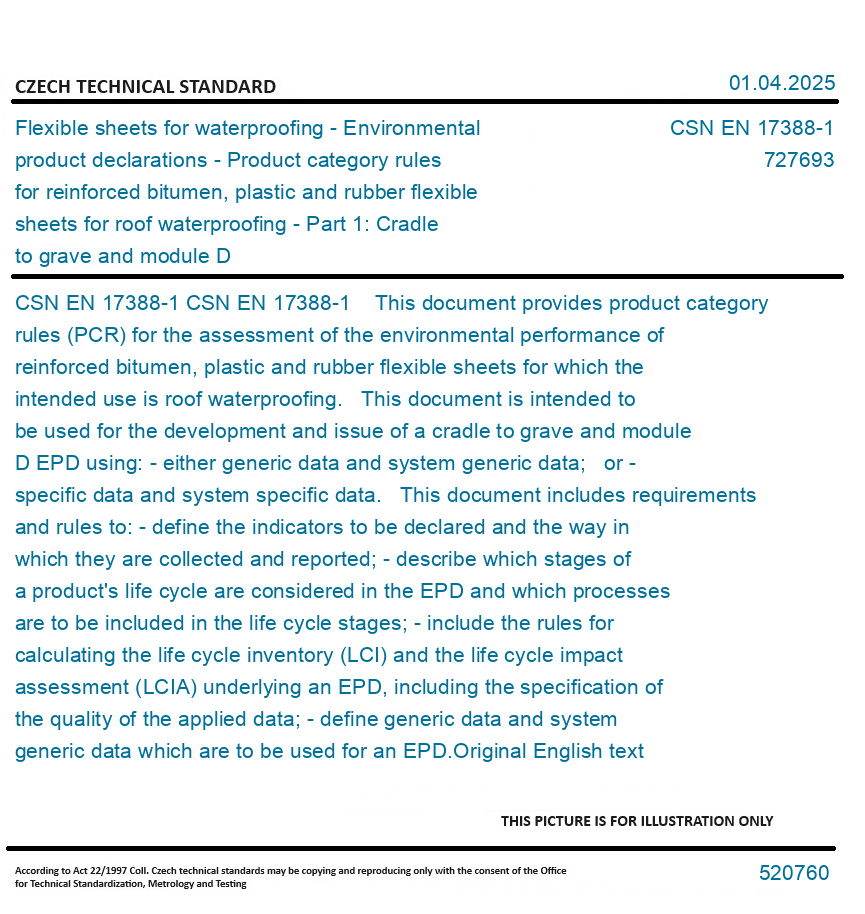CSN EN 17388-1 This document provides product category rules (PCR) for the assessment of the environmental performance of reinforced bitumen, plastic and rubber flexible sheets for which the intended use is roof waterproofing. This document is intended to be used for the development and issue of a cradle to grave and module D EPD using: - either generic data and system generic data; or - specific data and system specific data. This document includes requirements and rules to: - define the indicators to be declared and the way in which they are collected and reported; - describe which stages of a product's life cycle are considered in the EPD and which processes are to be included in the life cycle stages; - include the rules for calculating the life cycle inventory (LCI) and the life cycle impact assessment (LCIA) underlying an EPD, including the specification of the quality of the applied data; - define generic data and system generic data which are to be used for an EPD. Original English text of CSN EN Standard. The price of the Standard included all amendments and correcturs.