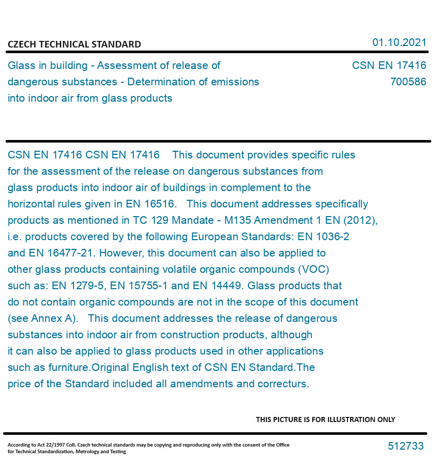 CSN EN 17416 This document provides specific rules for the assessment of the release on dangerous substances from glass products into indoor air of buildings in complement to the horizontal rules given in EN 16516. This document addresses specifically products as mentioned in TC 129 Mandate - M135 Amendment 1 EN (2012), i.e. products covered by the following European Standards: EN 1036-2 and EN 16477-21. However, this document can also be applied to other glass products containing volatile organic compounds (VOC) such as: EN 1279-5, EN 15755-1 and EN 14449. Glass products that do not contain organic compounds are not in the scope of this document (see Annex A). This document addresses the release of dangerous substances into indoor air from construction products, although it can also be applied to glass products used in other applications such as furniture. Original English text of CSN EN Standard. The price of the Standard included all amendments and correcturs.