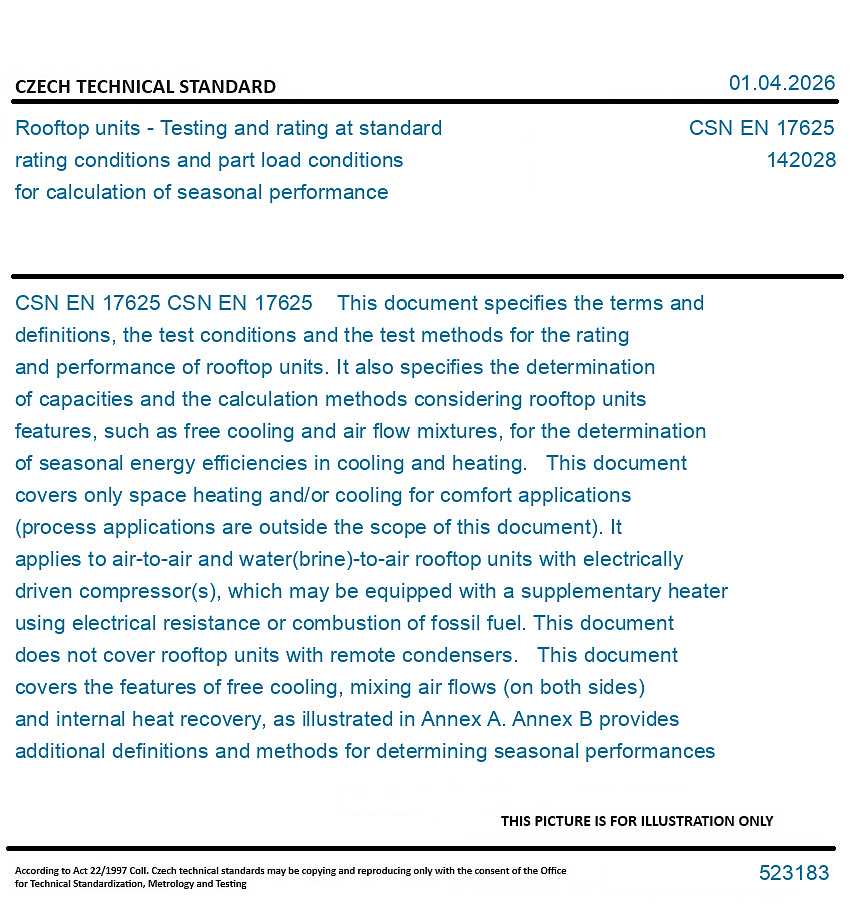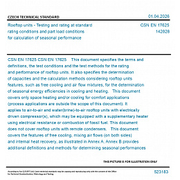 CSN EN 17625 This document specifies the terms and definitions, the test conditions and the test methods for the rating and performance of rooftop units. It also specifies the determination of capacities and the calculation methods considering rooftop units features, such as free cooling and air flow mixtures, for the determination of seasonal energy efficiencies in cooling and heating. This document covers only space heating and/or cooling for comfort applications (process applications are outside the scope of this document). It applies to air-to-air and water(brine)-to-air rooftop units with electrically driven compressor(s), which may be equipped with a supplementary heater using electrical resistance or combustion of fossil fuel. This document does not cover rooftop units with remote condensers. This document covers the features of free cooling, mixing air flows (on both sides) and internal heat recovery, as illustrated in Annex A. Annex B provides additional definitions and methods for determining seasonal performances for space cooling/heating with a minimum mixture of outdoor air and recycled air.
