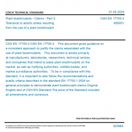 CSN EN 17700-3 This document gives guidance on a consistent approach to justify the claims associated with the use of plant biostimulants. This document is aimed primarily at manufacturers, laboratories, researchers, technical centres, and companies that intend to place plant biostimulants on the market, as well as notifying authorities, notified bodies, and market surveillance authorities. To be in compliance with this standard, it is important to also follow the recommendations and quality criteria described in the standard EN 17700-1:2024 on general principles to demonstrate plant biostimulant claims. Original English text of CSN EN Standard. The price of the Standard included all amendments and correcturs.