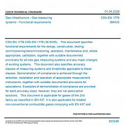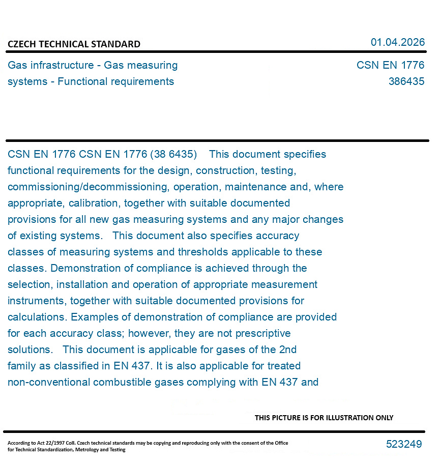 CSN EN 1776 (38 6435) This document specifies functional requirements for the design, construction, testing, commissioning/decommissioning, operation, maintenance and, where appropriate, calibration, together with suitable documented provisions for all new gas measuring systems and any major changes of existing systems. This document also specifies accuracy classes of measuring systems and thresholds applicable to these classes. Demonstration of compliance is achieved through the selection, installation and operation of appropriate measurement instruments, together with suitable documented provisions for calculations. Examples of demonstration of compliance are provided for each accuracy class; however, they are not prescriptive solutions. This document is applicable for gases of the 2nd family as classified in EN 437. It is also applicable for treated non-conventional combustible gases complying with EN 437 and for which a detailed technical evaluation of the functional requirements (such as injected biomethane) is performed ensuring there are no other constituents or properties of the gases that can affect the metrological and physical integrity of the measuring systems. This version mentions technical topics to consider when hydrogen and natural gas / hydrogen blends flow through the measuring systems. Blends with a hydrogen content between 20mol% and 98 mol% are not considered by this standard. This document applies to hydrogen with a purity as specified in CEN/TS 17977 for rededicated natural gas systems. This document can also be used as a guideline for measuring systems for other gases e.g. gaseous CO2 for CCUS. This document does not apply to for raw or sour gases. This document does not apply to for gas measurement in CNG filling stations. This document gives guidelines when designing, installing and operating gas meters with additional functionalities (smart gas meters). Communication protocols and interfaces for gas meters and remote reading of gas meters are outside the scope of this document and are covered by the appropriate parts of the EN 13757 series. which provide a number of protocols for meter communications. Supervisory control and data acquisition protocols (SCADA) are also not covered by this document. Unless otherwise specified all pressures used in this document are gauge pressures. For associated pressure regulating systems the requirements of EN 12186 and/or EN 12279 apply. For requirements on design, housing, lay-out, materials for components, construction, ventilation, venting and overall safety of gas measuring systems within the scope of this document, the EN 15001 series, EN 12186, EN 12279 and/or EN 1775 apply additionally, where relevant.