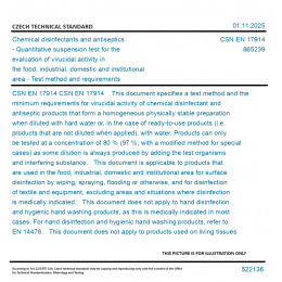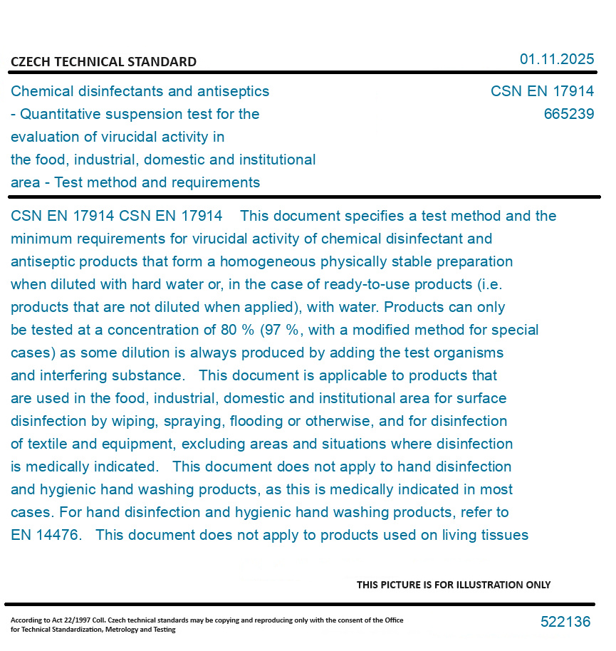 >CSN Standards>66 CHEMICAL INDUSTRY PRODUCTS>6652 Chemical disinfectants>CSN EN 17914 - Chemical disinfectants and antiseptics - Quantitative suspension test for the evaluation of virucidal activity in the food, industrial, domestic and institutional area - Test method and requirements (Phase 2/Step 1)