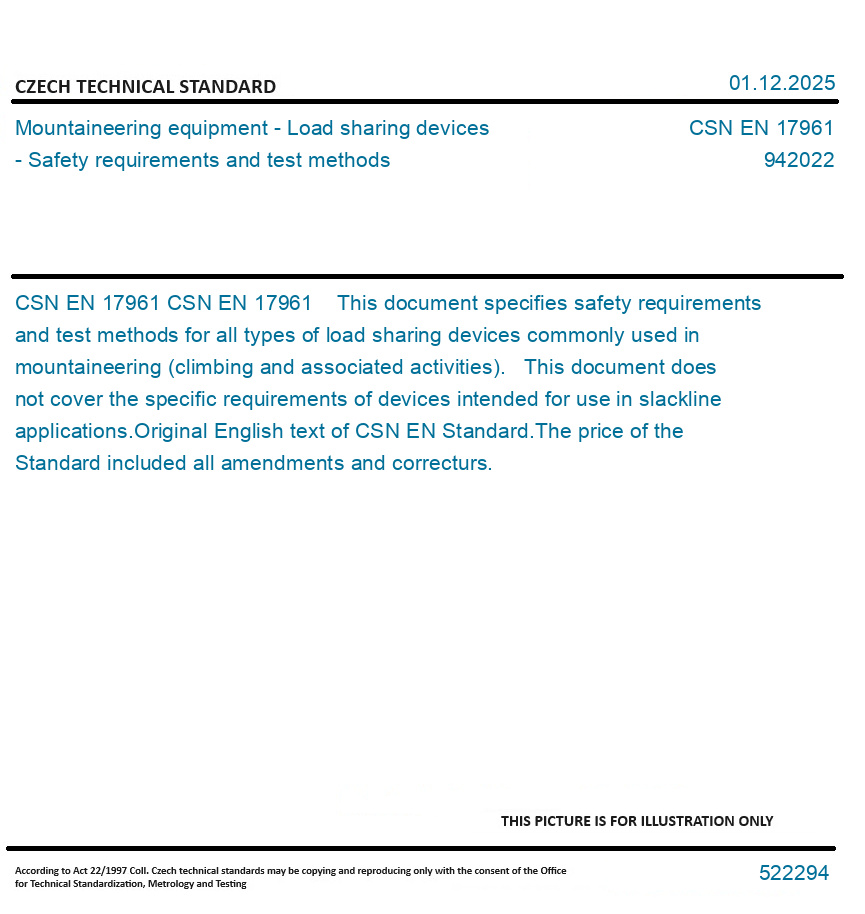 CSN EN 17961 This document specifies safety requirements and test methods for all types of load sharing devices commonly used in mountaineering (climbing and associated activities). This document does not cover the specific requirements of devices intended for use in slackline applications. Original English text of CSN EN Standard. The price of the Standard included all amendments and correcturs.