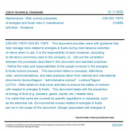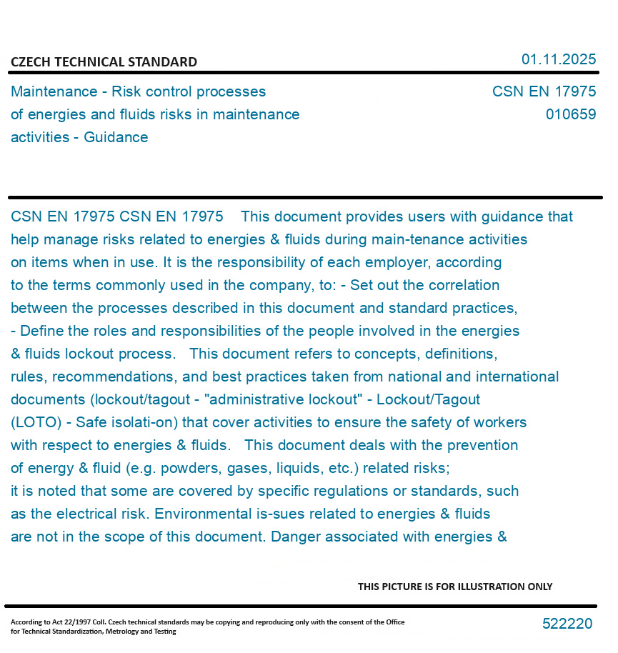 CSN EN 17975 This document provides users with guidance that help manage risks related to energies & fluids during main-tenance activities on items when in use. It is the responsibility of each employer, according to the terms commonly used in the company, to: - Set out the correlation between the processes described in this document and standard practices, - Define the roles and responsibilities of the people involved in the energies & fluids lockout process. This document refers to concepts, definitions, rules, recommendations, and best practices taken from national and international documents (lockout/tagout - "administrative lockout" - Lockout/Tagout (LOTO) - Safe isolati-on) that cover activities to ensure the safety of workers with respect to energies & fluids. This document deals with the prevention of energy & fluid (e.g. powders, gases, liquids, etc.) related risks; it is noted that some are covered by specific regulations or standards, such as the electrical risk. Environmental is-sues related to energies & fluids are not in the scope of this document. Danger associated with energies & fluids can be direct (e.g. contact, absorption, etc.) or indirect by reaction (e.g. mixing, heating, etc.). The scope includes all fluids because they can be intrinsically dangerous or become dangerous. The recommendations given in this document have been drawn up with a view to ensure the safety and health of workers around hazardous energies & fluids, and situations when they are conducting actions related to ma-intenance, settings or changing formats, regardless of the type of activity. The recommendations relate to activities carried out on items. They are applied before, during and after the operation to: - The energies & fluids supplied, contained, transported, or released by items, products, - Risks related to the presence of hazardous energies & fluids for the worker and the surrounding personal. This document is a methodological guideline within the maintenance standards. Original English text of CSN EN Standard. The price of the Standard included all amendments and correcturs.