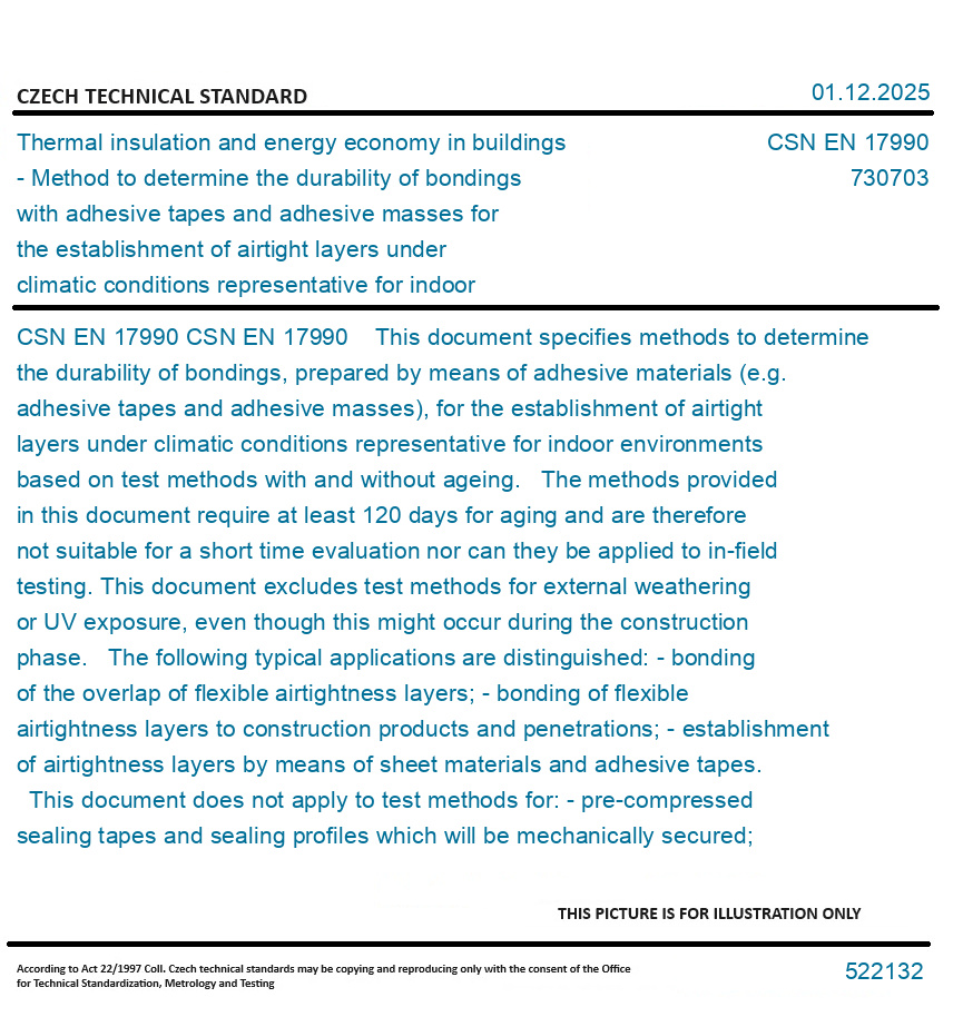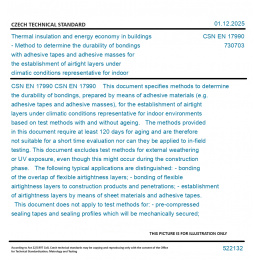 CSN EN 17990 This document specifies methods to determine the durability of bondings, prepared by means of adhesive materials (e.g. adhesive tapes and adhesive masses), for the establishment of airtight layers under climatic conditions representative for indoor environments based on test methods with and without ageing. The methods provided in this document require at least 120 days for aging and are therefore not suitable for a short time evaluation nor can they be applied to in-field testing. This document excludes test methods for external weathering or UV exposure, even though this might occur during the construction phase. The following typical applications are distinguished: - bonding of the overlap of flexible airtightness layers; - bonding of flexible airtightness layers to construction products and penetrations; - establishment of airtightness layers by means of sheet materials and adhesive tapes. This document does not apply to test methods for: - pre-compressed sealing tapes and sealing profiles which will be mechanically secured; - butyl-based adhesive tapes or adhesive masses; - sheet joints of wood-based panels or gypsum plasterboards with adhesive masses or filler systems; - bondings of bitumen membranes or of bitumen membranes to construction products; - bonding of self-adhesive membranes; - adhesive masses from reels. Adhesive masses from reels are cured viscoelastic adhesive masses, which are used in the same field of application as adhesive masses. The tack is not addressed. It does not allow any conclusion on the durability of a bonding. Original English text of CSN EN Standard. The price of the Standard included all amendments and correcturs.