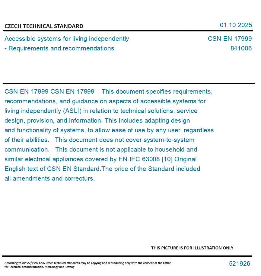 CSN EN 17999 This document specifies requirements, recommendations, and guidance on aspects of accessible systems for living independently (ASLI) in relation to technical solutions, service design, provision, and information. This includes adapting design and functionality of systems, to allow ease of use by any user, regardless of their abilities. This document does not cover system-to-system communication. This document is not applicable to household and similar electrical appliances covered by EN IEC 63008 [10]. Original English text of CSN EN Standard. The price of the Standard included all amendments and correcturs.