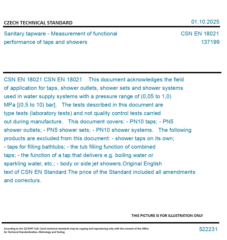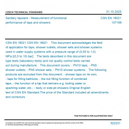 CSN EN 18021 This document acknowledges the field of application for taps, shower outlets, shower sets and shower systems used in water supply systems with a pressure range of (0,05 to 1,0) MPa [(0,5 to 10) bar]. The tests described in this document are type tests (laboratory tests) and not quality control tests carried out during manufacture. This document covers: - PN10 taps; - PN5 shower outlets; - PN5 shower sets; - PN10 shower systems. The following products are excluded from this document: - shower taps on its own; - taps for filling bathtubs; - the tub filling function of combined taps; - the function of a tap that delivers e.g. boiling water or sparkling water, etc.; - body or side jet showers. Original English text of CSN EN Standard. The price of the Standard included all amendments and correcturs.