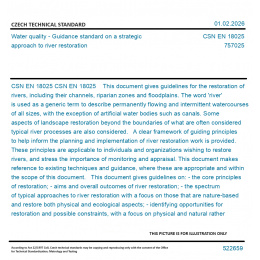 CSN EN 18025 This document gives guidelines for the restoration of rivers, including their channels, riparian zones and floodplains. The word 'river' is used as a generic term to describe permanently flowing and intermittent watercourses of all sizes, with the exception of artificial water bodies such as canals. Some aspects of landscape restoration beyond the boundaries of what are often considered typical river processes are also considered. A clear framework of guiding principles to help inform the planning and implementation of river restoration work is provided. These principles are applicable to individuals and organizations wishing to restore rivers, and stress the importance of monitoring and appraisal. This document makes reference to existing techniques and guidance, where these are appropriate and within the scope of this document. This document gives guidelines on: - the core principles of restoration; - aims and overall outcomes of river restoration; - the spectrum of typical approaches to river restoration with a focus on those that are nature-based and restore both physical and ecological aspects; - identifying opportunities for restoration and possible constraints, with a focus on physical and natural rather than socio-economic aspects; - different scales of restoration and how restoration works across different catchments and landscapes; - the importance of monitoring and appraising restoration work across the range of approaches and scales.