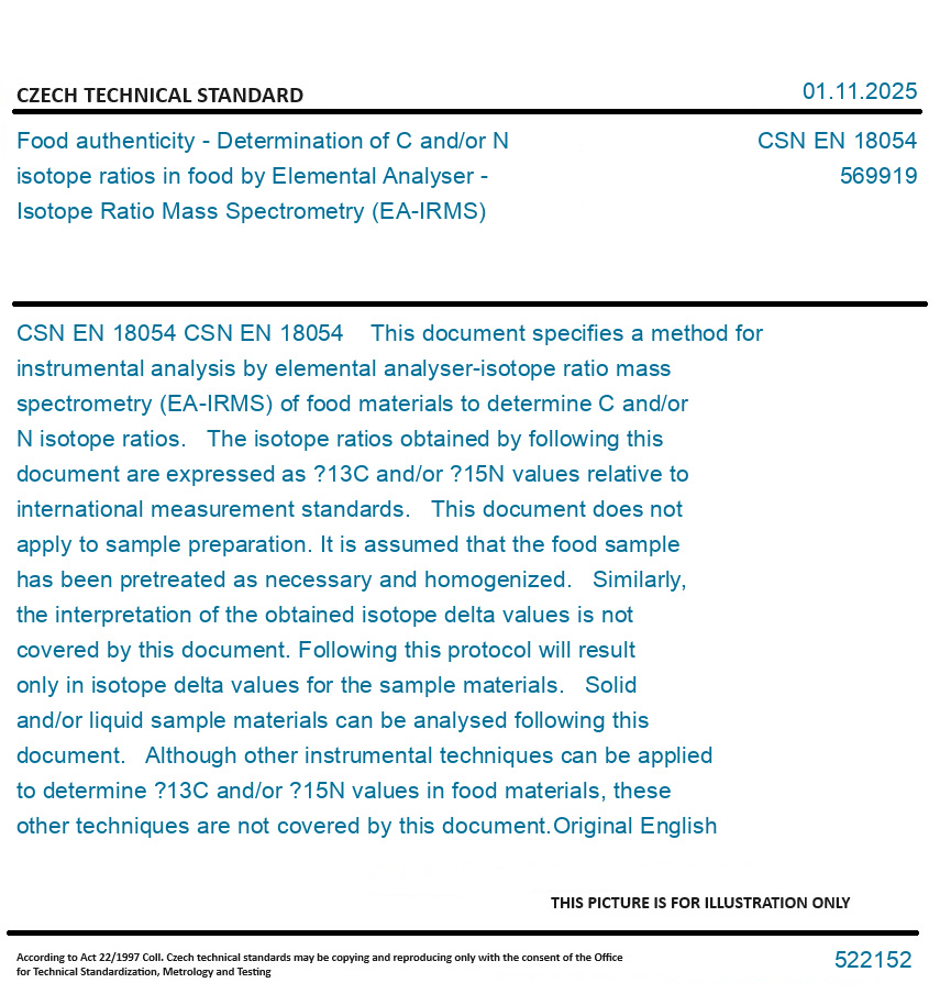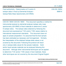 CSN EN 18054 This document specifies a method for instrumental analysis by elemental analyser-isotope ratio mass spectrometry (EA-IRMS) of food materials to determine C and/or N isotope ratios. The isotope ratios obtained by following this document are expressed as ?13C and/or ?15N values relative to international measurement standards. This document does not apply to sample preparation. It is assumed that the food sample has been pretreated as necessary and homogenized. Similarly, the interpretation of the obtained isotope delta values is not covered by this document. Following this protocol will result only in isotope delta values for the sample materials. Solid and/or liquid sample materials can be analysed following this document. Although other instrumental techniques can be applied to determine ?13C and/or ?15N values in food materials, these other techniques are not covered by this document. Original English text of CSN EN Standard. The price of the Standard included all amendments and correcturs.