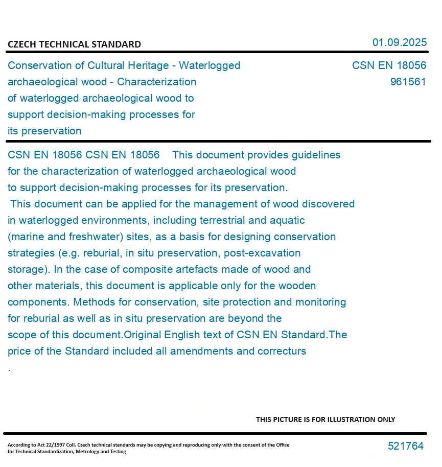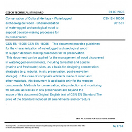 CSN EN 18056 This document provides guidelines for the characterization of waterlogged archaeological wood to support decision-making processes for its preservation. This document can be applied for the management of wood discovered in waterlogged environments, including terrestrial and aquatic (marine and freshwater) sites, as a basis for designing conservation strategies (e.g. reburial, in situ preservation, post-excavation storage). In the case of composite artefacts made of wood and other materials, this document is applicable only for the wooden components. Methods for conservation, site protection and monitoring for reburial as well as in situ preservation are beyond the scope of this document. Original English text of CSN EN Standard. The price of the Standard included all amendments and correcturs.