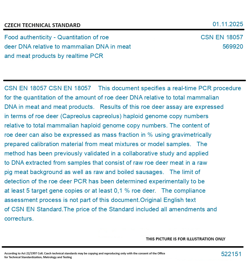 CSN EN 18057 This document specifies a real-time PCR procedure for the quantitation of the amount of roe deer DNA relative to total mammalian DNA in meat and meat products. Results of this roe deer assay are expressed in terms of roe deer (Capreolus capreolus) haploid genome copy numbers relative to total mammalian haploid genome copy numbers. The content of roe deer can also be expressed as mass fraction in % using gravimetrically prepared calibration material from meat mixtures or model samples. The method has been previously validated in a collaborative study and applied to DNA extracted from samples that consist of raw roe deer meat in a raw pig meat background as well as raw and boiled sausages. The limit of detection of the roe deer PCR has been determined experimentally to be at least 5 target gene copies or at least 0,1 % roe deer. The compliance assessment process is not part of this document. Original English text of CSN EN Standard. The price of the Standard included all amendments and correcturs.