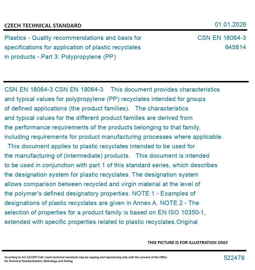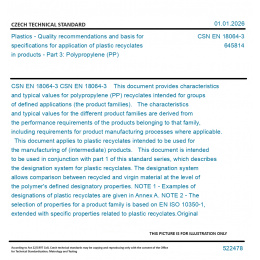 CSN EN 18064-3 This document provides characteristics and typical values for polypropylene (PP) recyclates intended for groups of defined applications (the product families). The characteristics and typical values for the different product families are derived from the performance requirements of the products belonging to that family, including requirements for product manufacturing processes where applicable. This document applies to plastic recyclates intended to be used for the manufacturing of (intermediate) products. This document is intended to be used in conjunction with part 1 of this standard series, which describes the designation system for plastic recyclates. The designation system allows comparison between recycled and virgin material at the level of the polymer's defined designatory properties. NOTE 1 - Examples of designations of plastic recyclates are given in Annex A. NOTE 2 - The selection of properties for a product family is based on EN ISO 10350-1, extended with specific properties related to plastic recyclates.