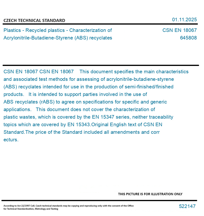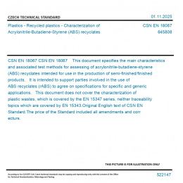 CSN EN 18067 This document specifies the main characteristics and associated test methods for assessing of acrylonitrile-butadiene-styrene (ABS) recyclates intended for use in the production of semi-finished/finished products. It is intended to support parties involved in the use of ABS recyclates (rABS) to agree on specifications for specific and generic applications. This document does not cover the characterization of plastic wastes, which is covered by the EN 15347 series, neither traceability topics which are covered by EN 15343. Original English text of CSN EN Standard. The price of the Standard included all amendments and correcturs.