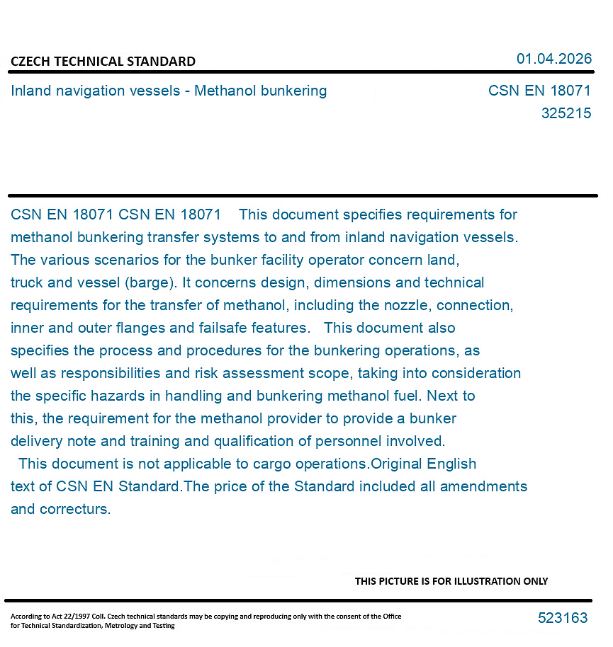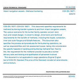 CSN EN 18071 This document specifies requirements for methanol bunkering transfer systems to and from inland navigation vessels. The various scenarios for the bunker facility operator concern land, truck and vessel (barge). It concerns design, dimensions and technical requirements for the transfer of methanol, including the nozzle, connection, inner and outer flanges and failsafe features. This document also specifies the process and procedures for the bunkering operations, as well as responsibilities and risk assessment scope, taking into consideration the specific hazards in handling and bunkering methanol fuel. Next to this, the requirement for the methanol provider to provide a bunker delivery note and training and qualification of personnel involved. This document is not applicable to cargo operations.