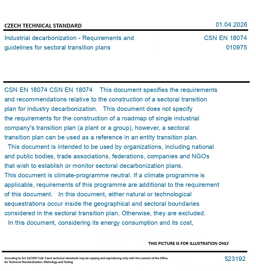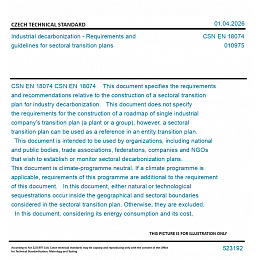 CSN EN 18074 This document specifies the requirements and recommendations relative to the construction of a sectoral transition plan for industry decarbonization. This document does not specify the requirements for the construction of a roadmap of single industrial company's transition plan (a plant or a group), however, a sectoral transition plan can be used as a reference in an entity transition plan. This document is intended to be used by organizations, including national and public bodies, trade associations, federations, companies and NGOs that wish to establish or monitor sectoral decarbonization plans. This document is climate-programme neutral. If a climate programme is applicable, requirements of this programme are additional to the requirement of this document. In this document, either natural or technological sequestrations occur inside the geographical and sectoral boundaries considered in the sectoral transition plan. Otherwise, they are excluded. In this document, considering its energy consumption and its cost, the direct air capture and storage technology (DACS) is not considered relevant and is excluded from the sectoral transition plan. Carbon offsets are excluded from this document.