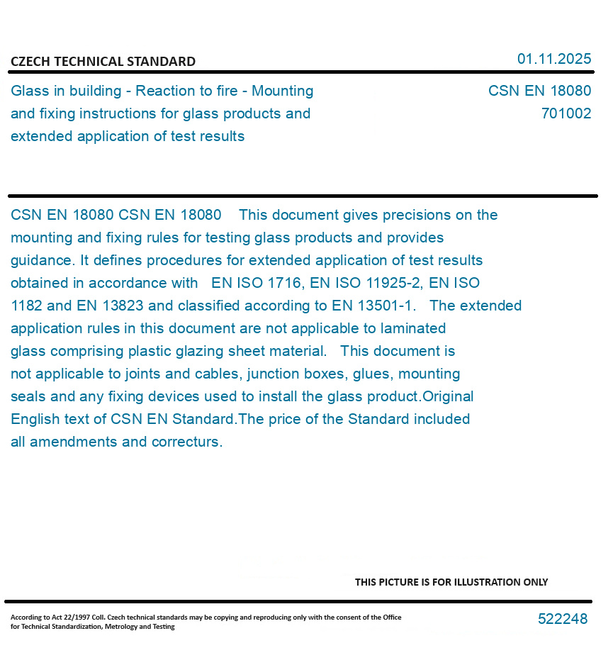 CSN EN 18080 This document gives precisions on the mounting and fixing rules for testing glass products and provides guidance. It defines procedures for extended application of test results obtained in accordance with EN ISO 1716, EN ISO 11925-2, EN ISO 1182 and EN 13823 and classified according to EN 13501-1. The extended application rules in this document are not applicable to laminated glass comprising plastic glazing sheet material. This document is not applicable to joints and cables, junction boxes, glues, mounting seals and any fixing devices used to install the glass product. Original English text of CSN EN Standard. The price of the Standard included all amendments and correcturs.