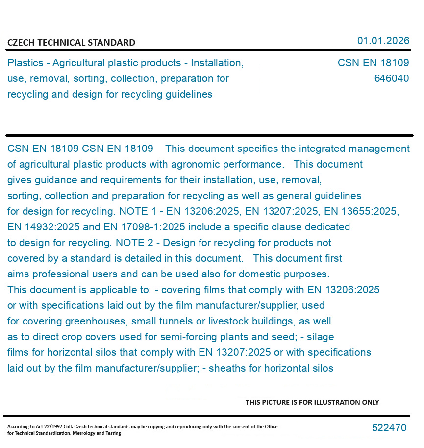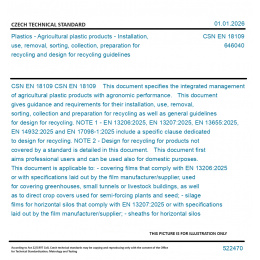 CSN EN 18109 This document specifies the integrated management of agricultural plastic products with agronomic performance. This document gives guidance and requirements for their installation, use, removal, sorting, collection and preparation for recycling as well as general guidelines for design for recycling. NOTE 1 - EN 13206:2025, EN 13207:2025, EN 13655:2025, EN 14932:2025 and EN 17098-1:2025 include a specific clause dedicated to design for recycling. NOTE 2 - Design for recycling for products not covered by a standard is detailed in this document. This document first aims professional users and can be used also for domestic purposes. This document is applicable to: - covering films that comply with EN 13206:2025 or with specifications laid out by the film manufacturer/supplier, used for covering greenhouses, small tunnels or livestock buildings, as well as to direct crop covers used for semi-forcing plants and seed; - silage films for horizontal silos that comply with EN 13207:2025 or with specifications laid out by the film manufacturer/supplier; - sheaths for horizontal silos (forage crop and grain storage) that comply with EN 13207:2025 or with specifications laid out by the sheath manufacturer/supplier; - stretch films for wrapping bales that comply with EN 14932:2025 or with specifications laid out by the film manufacturer/supplier; - thermoplastic mulching films that comply with EN 13655:2025 or with specifications laid out by the film manufacturer/supplier; - barrier films for agricultural and horticultural soil disinfection by fumigation that comply with EN 17098-1:2025; - nets and twines for catling and horticulture that comply with the specifications laid out by EN ISO 4167 or by the manufacturer/supplier; - flexible ducts, semi-rigid and rigid pipes and fittings for irrigation that comply with ISO 8779, EN ISO 9261, ISO 13460-1, ISO 16438, EN 14267, EN 12324-2, EN 13635, EN 13997, EN 17176-2:2019+A1:2022 or with specifications laid out by the manufacturer/supplier; - fabrics and non-woven nets and sheets for catling and horticulture that comply with ISO 9073 series or with specifications laid out by the manufacturer/supplier. This document does not cover construction, packaging and food-contact products. NOTE 3 - For products non-suitable for recycling in the context of this document, specific procedures apply.