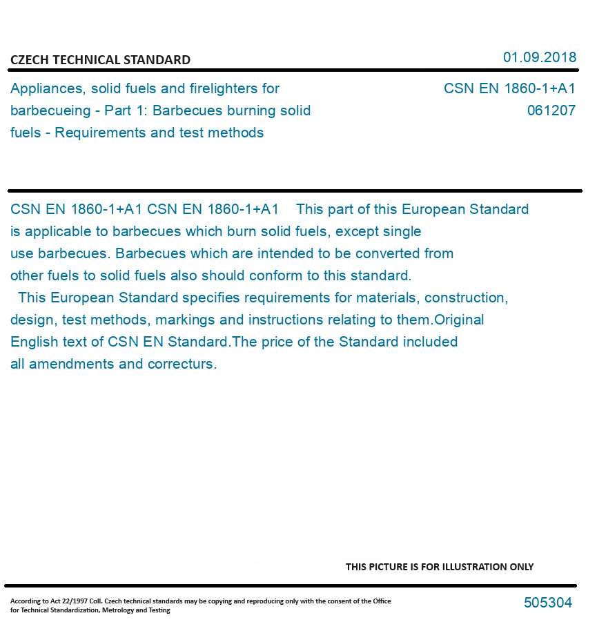 CSN EN 1860-1+A1 This part of this European Standard is applicable to barbecues which burn solid fuels, except single use barbecues. Barbecues which are intended to be converted from other fuels to solid fuels also should conform to this standard. This European Standard specifies requirements for materials, construction, design, test methods, markings and instructions relating to them. Original English text of CSN EN Standard. The price of the Standard included all amendments and correcturs.