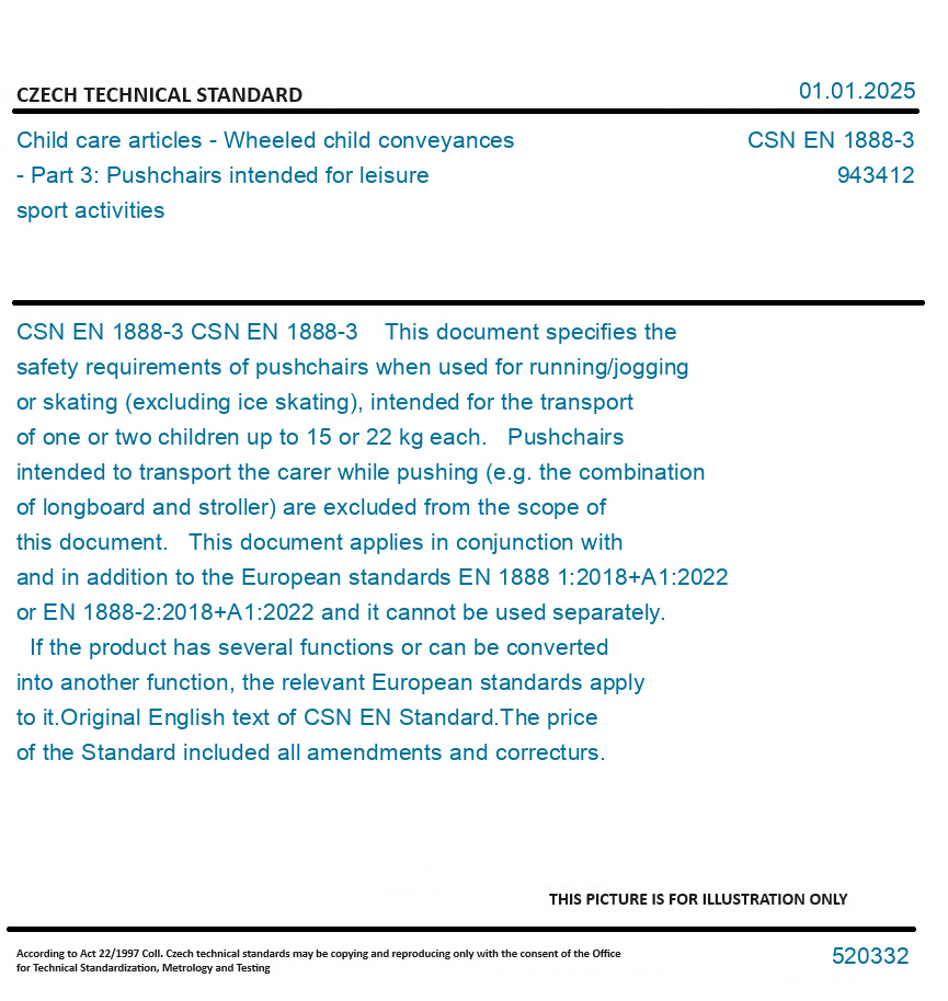 CSN EN 1888-3 This document specifies the safety requirements of pushchairs when used for running/jogging or skating (excluding ice skating), intended for the transport of one or two children up to 15 or 22 kg each. Pushchairs intended to transport the carer while pushing (e.g. the combination of longboard and stroller) are excluded from the scope of this document. This document applies in conjunction with and in addition to the European standards EN 1888 1:2018+A1:2022 or EN 1888-2:2018+A1:2022 and it cannot be used separately. If the product has several functions or can be converted into another function, the relevant European standards apply to it. Original English text of CSN EN Standard. The price of the Standard included all amendments and correcturs.
