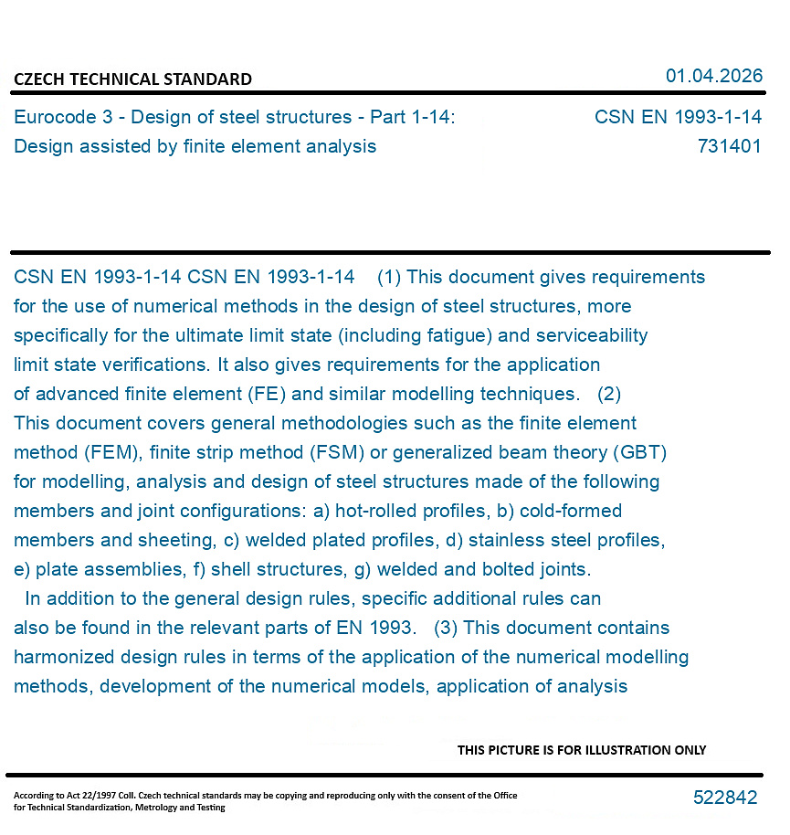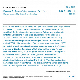 CSN EN 1993-1-14 (1) This document gives requirements for the use of numerical methods in the design of steel structures, more specifically for the ultimate limit state (including fatigue) and serviceability limit state verifications. It also gives requirements for the application of advanced finite element (FE) and similar modelling techniques. (2) This document covers general methodologies such as the finite element method (FEM), finite strip method (FSM) or generalized beam theory (GBT) for modelling, analysis and design of steel structures made of the following members and joint configurations: a) hot-rolled profiles, b) cold-formed members and sheeting, c) welded plated profiles, d) stainless steel profiles, e) plate assemblies, f) shell structures, g) welded and bolted joints. In addition to the general design rules, specific additional rules can also be found in the relevant parts of EN 1993. (3) This document contains harmonized design rules in terms of the application of the numerical modelling methods, development of the numerical models, application of analysis types, result evaluation methods, and determination of the resistance of steel structures for different limit states. (4) This document provides rules for numerical modelling and design of steel structures using all steel grades from S235 up to and including S700, unless otherwise stated in individual clauses. Assumptions: (1) This document gives rules intended for engineers who are experienced in the use of FE. (2) It is recognized that structural analysis, based upon the laws of physics, has been successfully researched, developed, historically or currently used for the design and verification of elements or whole structural frames. This remains appropriate for many structural solutions. However, as an alternative, the methods described in this document can be also applied for design. (3) Unless specifically stated, EN 1990, EN 1991 (all parts) and the other relevant parts of EN 1993-1 apply. (4) The design methods given in this document are applicable if - the execution quality is as specified in EN 1090-2 and/or EN 1090-4, and - the construction materials and products used are as specified in the relevant parts of EN 1993, or in the relevant material and product specifications.