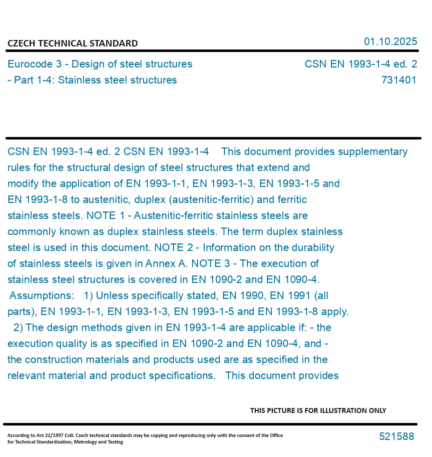CSN EN 1993-1-4 This document provides supplementary rules for the structural design of steel structures that extend and modify the application of EN 1993-1-1, EN 1993-1-3, EN 1993-1-5 and EN 1993-1-8 to austenitic, duplex (austenitic-ferritic) and ferritic stainless steels. NOTE 1 - Austenitic-ferritic stainless steels are commonly known as duplex stainless steels. The term duplex stainless steel is used in this document. NOTE 2 - Information on the durability of stainless steels is given in Annex A. NOTE 3 - The execution of stainless steel structures is covered in EN 1090-2 and EN 1090-4. Assumptions: 1) Unless specifically stated, EN 1990, EN 1991 (all parts), EN 1993-1-1, EN 1993-1-3, EN 1993-1-5 and EN 1993-1-8 apply. 2) The design methods given in EN 1993-1-4 are applicable if: - the execution quality is as specified in EN 1090-2 and EN 1090-4, and - the construction materials and products used are as specified in the relevant material and product specifications. This document provides rules for structural design of cold-formed steel members and sheeting. This document applies to cold-formed steel products made from coated or uncoated hot- or cold-rolled sheet or strip, which have been cold-formed by processes such as roll-forming or press-braking. It also covers sheeting and members which are curved during fabrication by continuous bending or roll-forming. Sheeting which has the curvature created by crushing the inner flanges is not included. This document is also applicable to the design of profiled steel sheeting for composite steel and concrete slabs at the construction stage, see EN 1994 (all parts). The execution of steel structures made of cold-formed steel members and sheeting is covered in EN 1090-4. Provisions for bolted connections are provided in EN 1090-2. NOTE - The rules in EN 1993-1-3 complement the rules in the other parts of EN 1993-1. Methods are also given for stressed-skin design, using steel sheeting as a structural diaphragm. This document does not apply to cold-formed circular and rectangular structural hollow sections supplied to EN 10219 (all parts), for which reference is made to EN 1993-1-1 and EN 1993-1-8. This document provides methods for design by calculation and for design assisted by testing. The methods for design by calculation apply only within the stated ranges of material properties and geo-metric proportions, for which sufficient experience and test evidence is available. These limitations do not apply to design assisted by testing. Unless specifically stated, EN 1990, EN 1991 (all parts) and EN 1993-1-1 apply. The design methods given in EN 1993-1-3 are applicable if: - the execution quality is as specified in EN 1090-4, the execution quality of bolted connections is as specified in EN 1090-2, and - the construction materials and products are as specified in the relevant parts of EN 1993 (all parts), or in the relevant material and product specifications. EN 1993 is intended to be used in conjunction with: - the parts of EN 1992 to EN 1999 where steel structures or steel components are referred to within those documents; - EN standards for construction products relevant to steel structures. Original English text of CSN EN Standard. The price of the Standard included all amendments and correcturs.