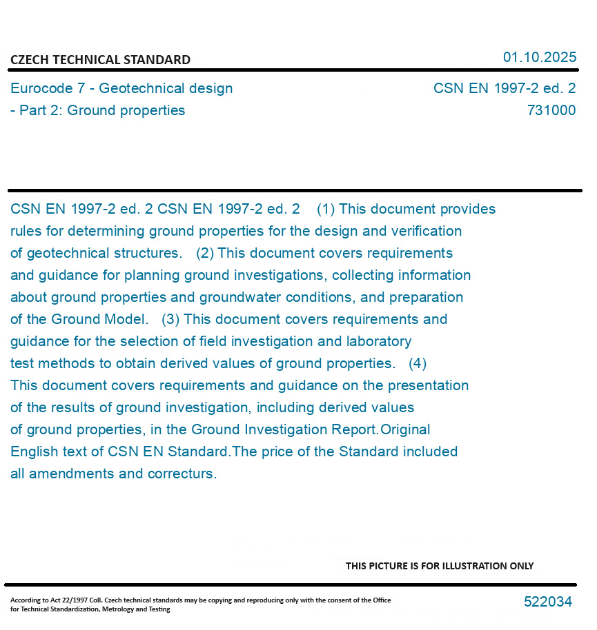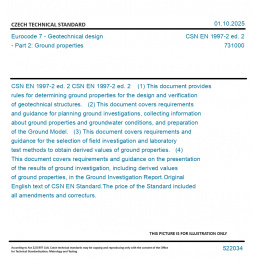CSN EN 1997-2 ed. 2 (1) This document provides rules for determining ground properties for the design and verification of geotechnical structures. (2) This document covers requirements and guidance for planning ground investigations, collecting information about ground properties and groundwater conditions, and preparation of the Ground Model. (3) This document covers requirements and guidance for the selection of field investigation and laboratory test methods to obtain derived values of ground properties. (4) This document covers requirements and guidance on the presentation of the results of ground investigation, including derived values of ground properties, in the Ground Investigation Report. Original English text of CSN EN Standard. The price of the Standard included all amendments and correcturs.