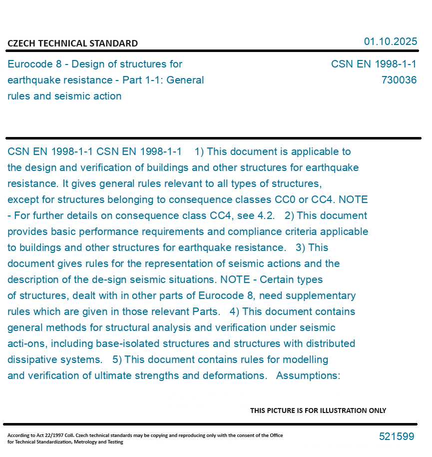 CSN EN 1998-1-1 1) This document is applicable to the design and verification of buildings and other structures for earthquake resistance. It gives general rules relevant to all types of structures, except for structures belonging to consequence classes CC0 or CC4. NOTE - For further details on consequence class CC4, see 4.2. 2) This document provides basic performance requirements and compliance criteria applicable to buildings and other structures for earthquake resistance. 3) This document gives rules for the representation of seismic actions and the description of the de-sign seismic situations. NOTE - Certain types of structures, dealt with in other parts of Eurocode 8, need supplementary rules which are given in those relevant Parts. 4) This document contains general methods for structural analysis and verification under seismic acti-ons, including base-isolated structures and structures with distributed dissipative systems. 5) This document contains rules for modelling and verification of ultimate strengths and deformations. Assumptions: 1) The assumptions of EN 1990 apply to this document. 2) It is assumed that no change in the structure and in the masses carried by the structure takes place during the construction phase or during the subsequent life of the structure with respect to the design unless proper justification and verification is provided. This applies also to ancillary elements (see 3.1.2). Due to the specific nature of seismic response, this applies even in the case of changes that lead to an increase of the structural resistance. 3) The design documents are assumed to indicate the geometry, the detailing, and the properties of the materials of all structural members. If appropriate, the design documents are also assumed to include the properties of special devices to be used and the distances between structural and ancillary elements. The necessary quality control provisions are assumed to be specified. 4) Members of special structural importance requiring special checking during construction are as-sumed to be identified in the design documents and the verification methods to be used are assumed to be specified. 5) It is assumed that in the case of high seismic action class (4.1.1(4)), formal quality system plans, covering design, construction, and use, additional to the control procedures prescribed in the other relevant Eurocodes, are specified. Original English text of CSN EN Standard. The price of the Standard included all amendments and correcturs.