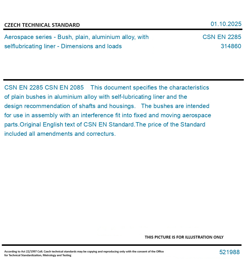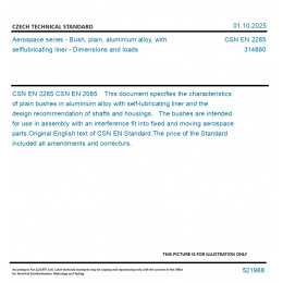 CSN EN 2085 This document specifies the characteristics of plain bushes in aluminium alloy with self-lubricating liner and the design recommendation of shafts and housings. The bushes are intended for use in assembly with an interference fit into fixed and moving aerospace parts. Original English text of CSN EN Standard. The price of the Standard included all amendments and correcturs.