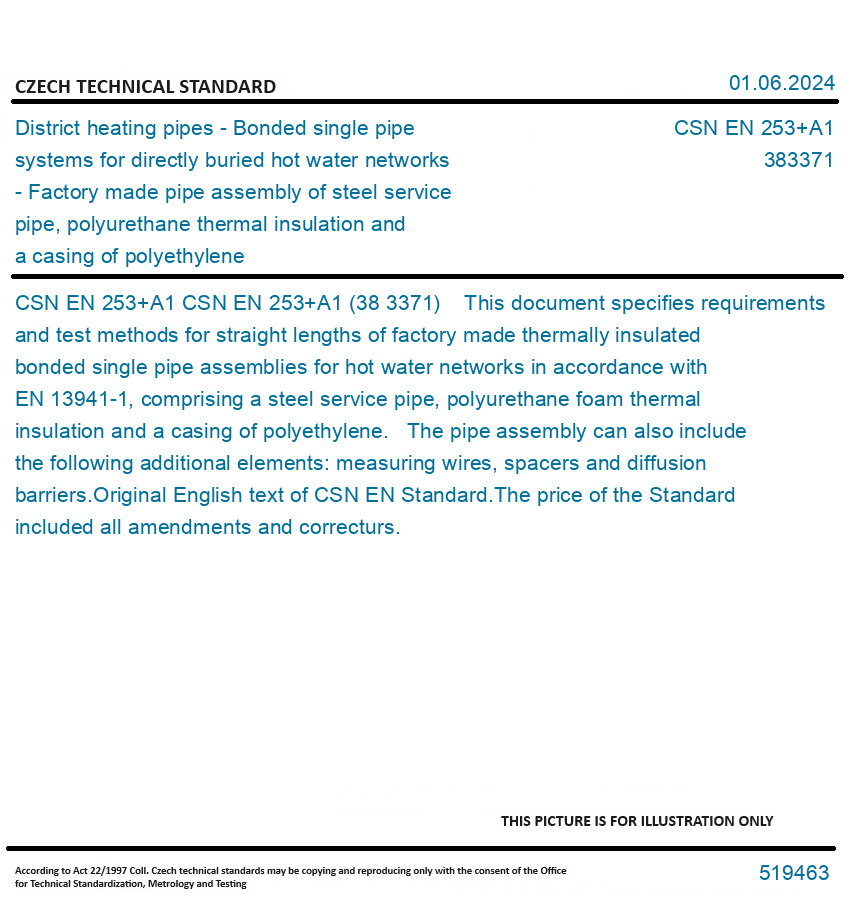 CSN EN 253+A1 (38 3371) This document specifies requirements and test methods for straight lengths of factory made thermally insulated bonded single pipe assemblies for hot water networks in accordance with EN 13941-1, comprising a steel service pipe, polyurethane foam thermal insulation and a casing of polyethylene. The pipe assembly can also include the following additional elements: measuring wires, spacers and diffusion barriers. Original English text of CSN EN Standard. The price of the Standard included all amendments and correcturs.