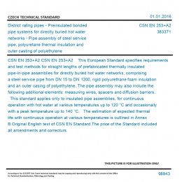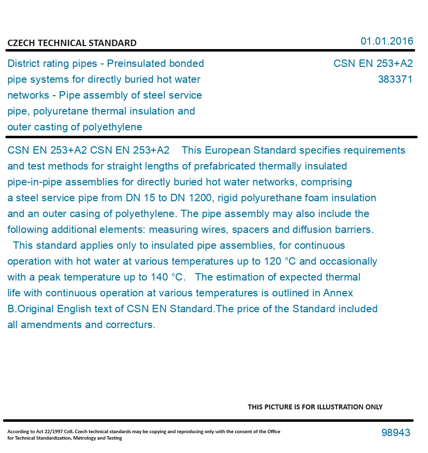 CSN EN 253+A2 This European Standard specifies requirements and test methods for straight lengths of prefabricated thermally insulated pipe-in-pipe assemblies for directly buried hot water networks, comprising a steel service pipe from DN 15 to DN 1200, rigid polyurethane foam insulation and an outer casing of polyethylene. The pipe assembly may also include the following additional elements: measuring wires, spacers and diffusion barriers. This standard applies only to insulated pipe assemblies, for continuous operation with hot water at various temperatures up to 120 °C and occasionally with a peak temperature up to 140 °C. The estimation of expected thermal life with continuous operation at various temperatures is outlined in Annex B. Original English text of CSN EN Standard. The price of the Standard included all amendments and correcturs.