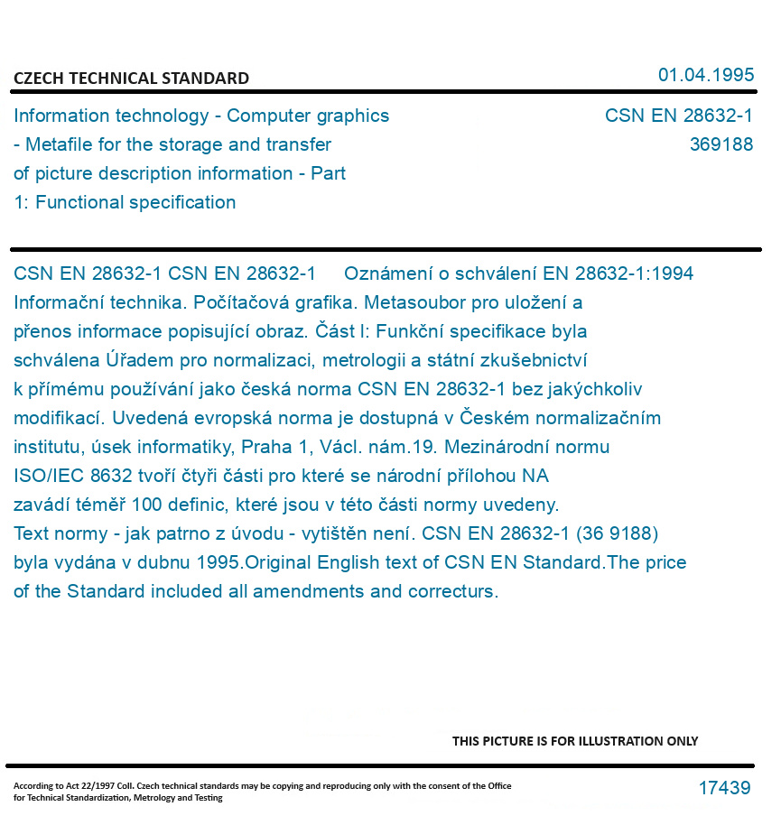 CSN EN 28632-1 Oznámení o schválení EN 28632-1:1994 Informační technika. Počítačová grafika. Metasoubor pro uložení a přenos informace popisující obraz. Část l: Funkční specifikace byla schválena Úřadem pro normalizaci, metrologii a státní zkušebnictví k přímému používání jako česká norma CSN EN 28632-1 bez jakýchkoliv modifikací. Uvedená evropská norma je dostupná v Českém normalizačním institutu, úsek informatiky, Praha 1, Václ. nám.19. Mezinárodní normu ISO/IEC 8632 tvoří čtyři části pro které se národní přílohou NA zavádí téměř 100 definic, které jsou v této části normy uvedeny. Text normy - jak patrno z úvodu - vytištěn není. CSN EN 28632-1 (36 9188) byla vydána v dubnu 1995. Original English text of CSN EN Standard. The price of the Standard included all amendments and correcturs.