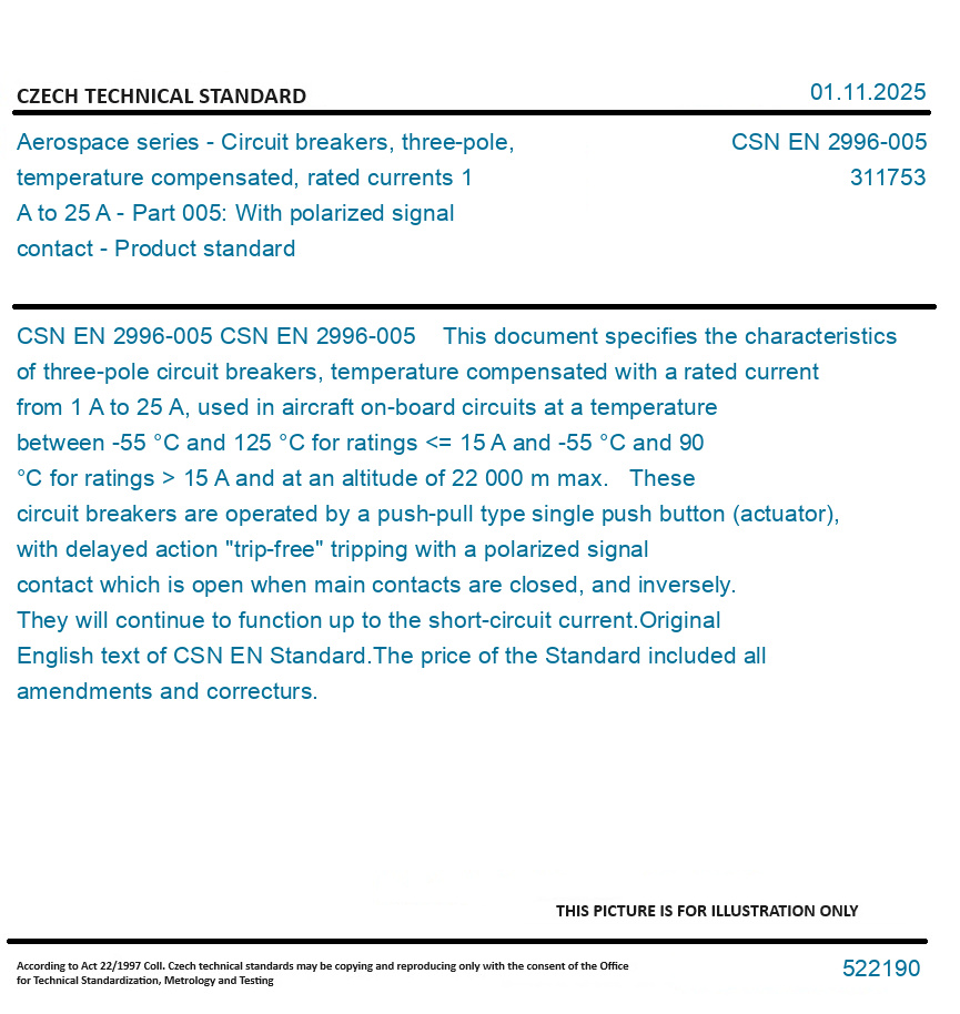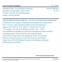 CSN EN 2996-005 This document specifies the characteristics of three-pole circuit breakers, temperature compensated with a rated current from 1 A to 25 A, used in aircraft on-board circuits at a temperature between -55 °C and 125 °C for ratings <= 15 A and -55 °C and 90 °C for ratings > 15 A and at an altitude of 22 000 m max. These circuit breakers are operated by a push-pull type single push button (actuator), with delayed action "trip-free" tripping with a polarized signal contact which is open when main contacts are closed, and inversely. They will continue to function up to the short-circuit current. Original English text of CSN EN Standard. The price of the Standard included all amendments and correcturs.