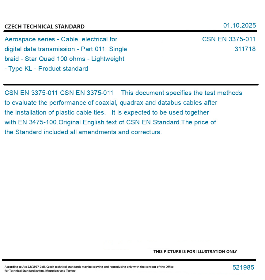 CSN EN 3375-011 This document specifies the test methods to evaluate the performance of coaxial, quadrax and databus cables after the installation of plastic cable ties. It is expected to be used together with EN 3475-100. Original English text of CSN EN Standard. The price of the Standard included all amendments and correcturs.